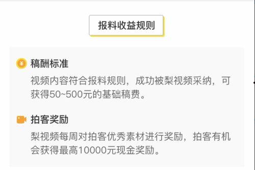 最近在网上看到一个超级劲爆的消息,就是关于梨视频爆料的价格问题。你是不是也很好奇,那些热门的爆料视频背后,究竟需要多少钱才能制作出来呢?今天,我就来给你揭秘一下这个神秘的价格之谜!